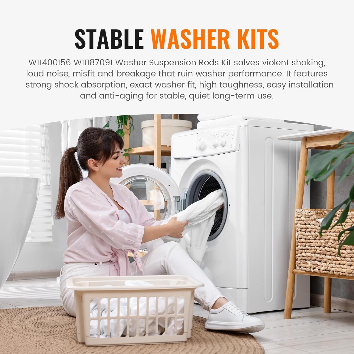 The W11400156 suspension rods kit offers a complete replacement solution for top-load washer maintenance, addressing common vibration and stability issues in Whirlpool, Kenmore, and Maytag models. Including four suspension rods, four suspension balls, and four bushings, the set provides all components needed for full suspension system repairs. Homeowners and DIY enthusiasts can utilize the kit to restore washer balance and reduce operational noise, supporting efficient laundry cycles and minimizing repair delays from incomplete part sets.Direct replacement OEM part numbers include W11400156, W11187091, AP6976426, PS12731247, and EAP12731247, engineered to align with factory specifications for proper integration. Compatibility covers Whirlpool, Kenmore, and Maytag washer models such as 11031652020, 7MMVW7230LC0, MVW7230HC0, WTW500CMW0, WTW6150PB0, WTW7120HC0, WTW8120HC0, and related variants. The suspension rods kit ensures accurate fitment across specified top-load washers, simplifying part selection and reducing compatibility concerns during repairs.Durable construction from quality materials helps the suspension rods and bushings withstand regular washing cycles, maintaining performance under daily use. Robust design resists wear and supports extended service life, potentially lowering future repair frequency. Tool-free installation allows straightforward DIY setup without specialized tools, with matching components facilitating quick assembly and secure integration into washer suspension systems.Installation requires no technical expertise, enabling most users to complete replacements promptly and reduce appliance downtime. The process involves simple component alignment and assembly, potentially saving on professional service costs. Product commitment emphasizes reliable performance through precise engineering and durable materials, ensuring long-term washer functionality and customer satisfaction in household laundry applications.